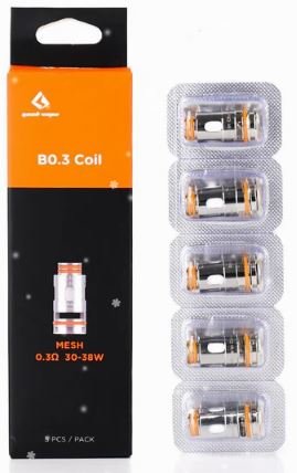 | B0.6 Coil | 0.6Ω | 15-25W | Aegis Boost / Aegis Boost Plus / Aegis Boost 2 / Aegis Hero Aegis H45 / Aegis H45 RTE / Zeus Nano 2 Tank / Z50 Kit / Geekvape M100 / Aegis Boost LE Bonus |